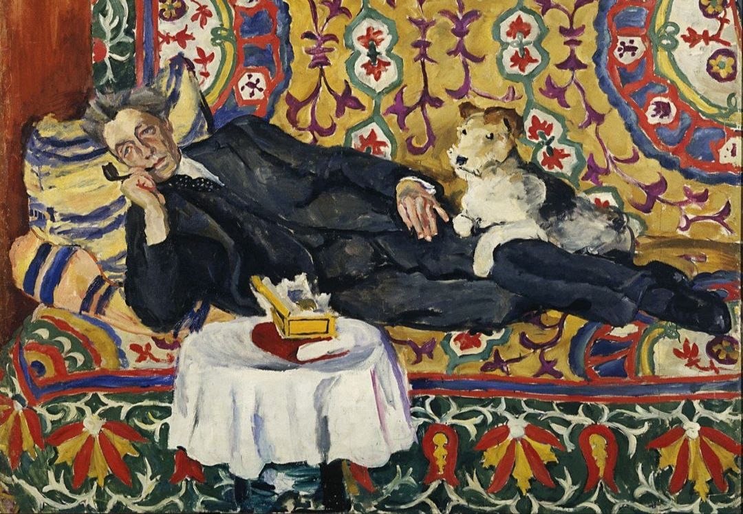 At the estate, he created a gallery of portraits of Soviet cultural figures. He painted director Vsevolod Meyerhold during a difficult period: his theater was closed, less than a year before his arrest. Against the backdrop of a bright carpet, the figure of the recumbent director in a black suit, accompanied by his beloved fox terrier, seems especially dramatic.