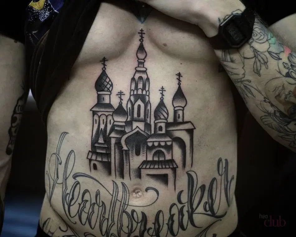 This is one of the most widespread tattoo designs that is easily recognizable in the Russian criminal underworld. Only a convict who has served his time can get a church or a kremlin tattooed on his body. Also, the number of domes is not random; it equals the number of prison terms served by the owner of the tattoo.